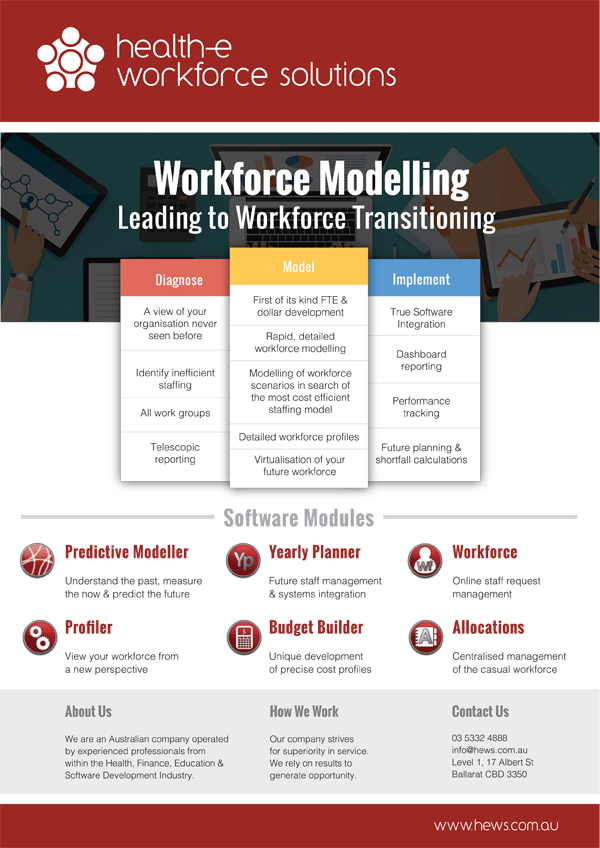 Health-e Workforce Solutions (HWS) is a proud Australian company that develops targeted software to facilitate the analysis and management of the entire healthcare workforce. HWS is rapidly expanding locally and internationally, through the development of our innovative technology and consultancy solutions. The software modules drive workforce reform and optimisation by enabling workforce modelling, planning and benchmarking. HWS allows a healthcare service to understand the past, measure the now and plan for the future. We currently serve 50 hospital clients with a unique and proven offering that is unparalleled worldwide.”